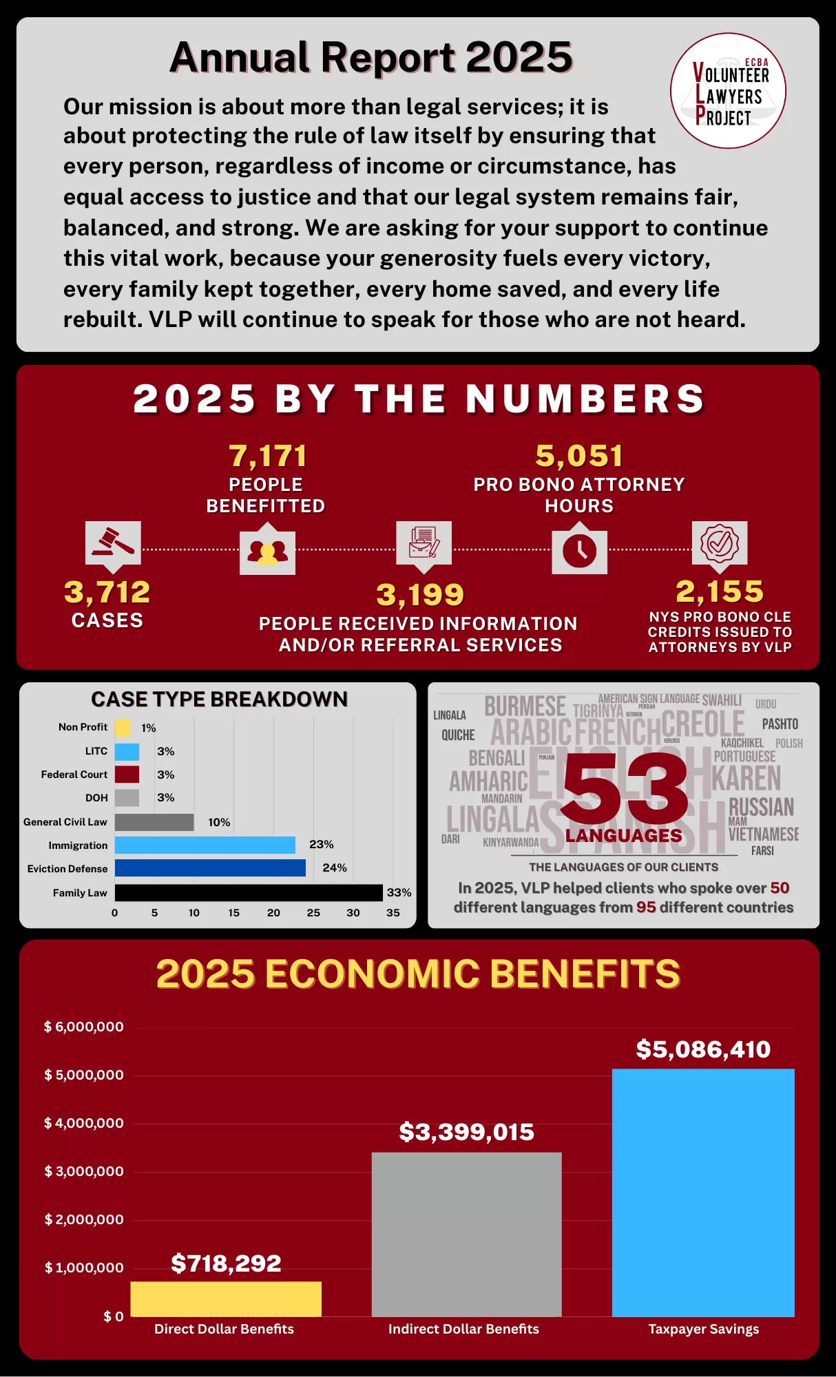 We ask you to help us continue our mission, to stand up for our community members, and to speak for those who are not heard. At VLP, we give a voice to victims of human trafficking and domestic violence. We assist refugees fleeing torture and persecution. Our work benefits clients facing family court issues, matrimonial issues, eviction, and bankruptcy. We could not do this important work without support from donors like you. Here is a sample of the life-changing work we have done this past year: